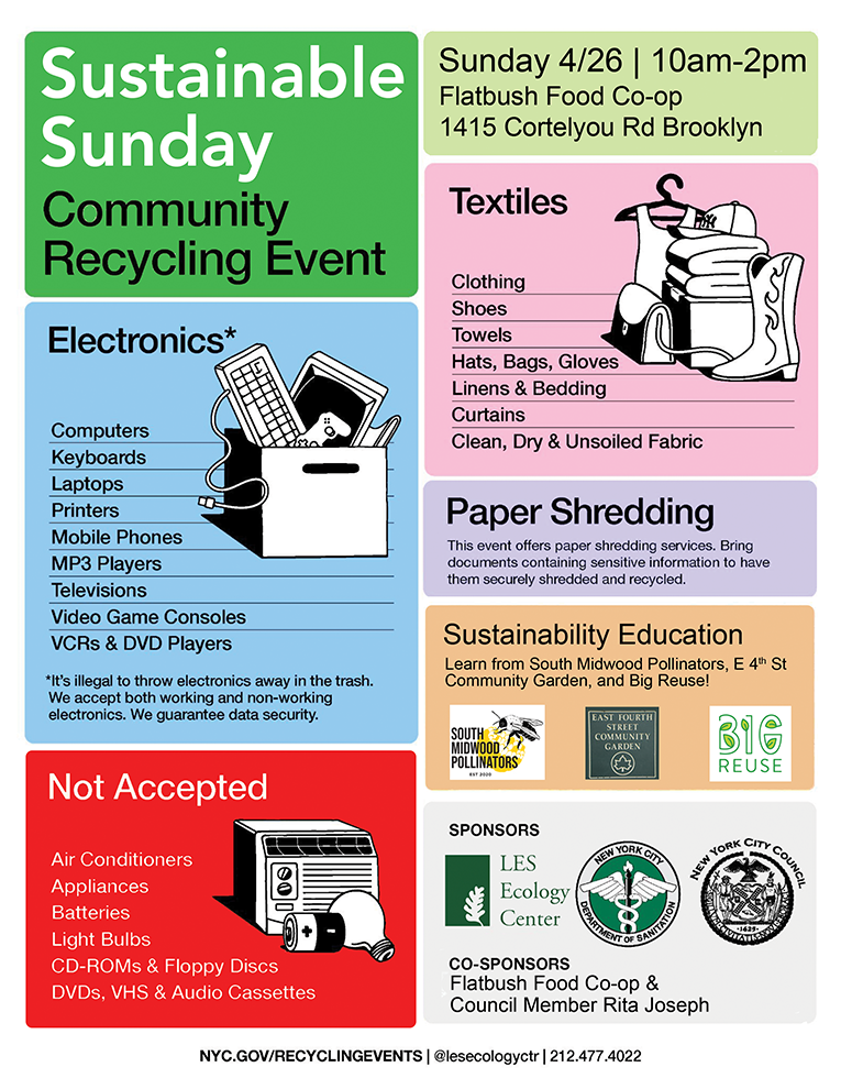 Drop off your unwanted or broken electronics at Flatbush Food Co-op for environmentally safe disposal- plus recycle textiles and papers!