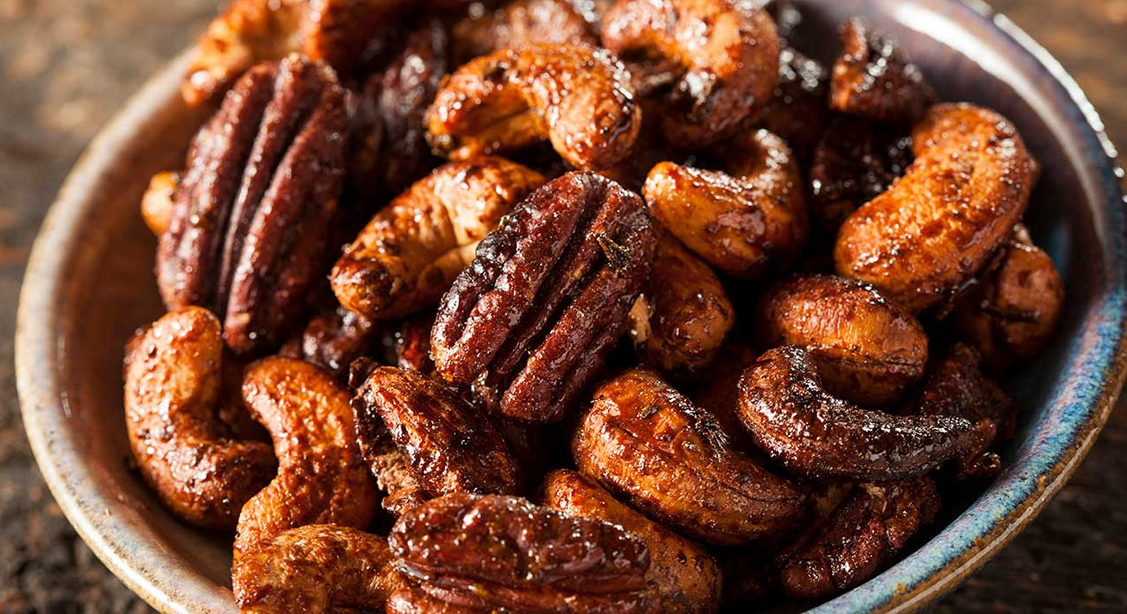 - In a bowl, combine nuts and pour warm syrup over nuts. Stir until well coated.